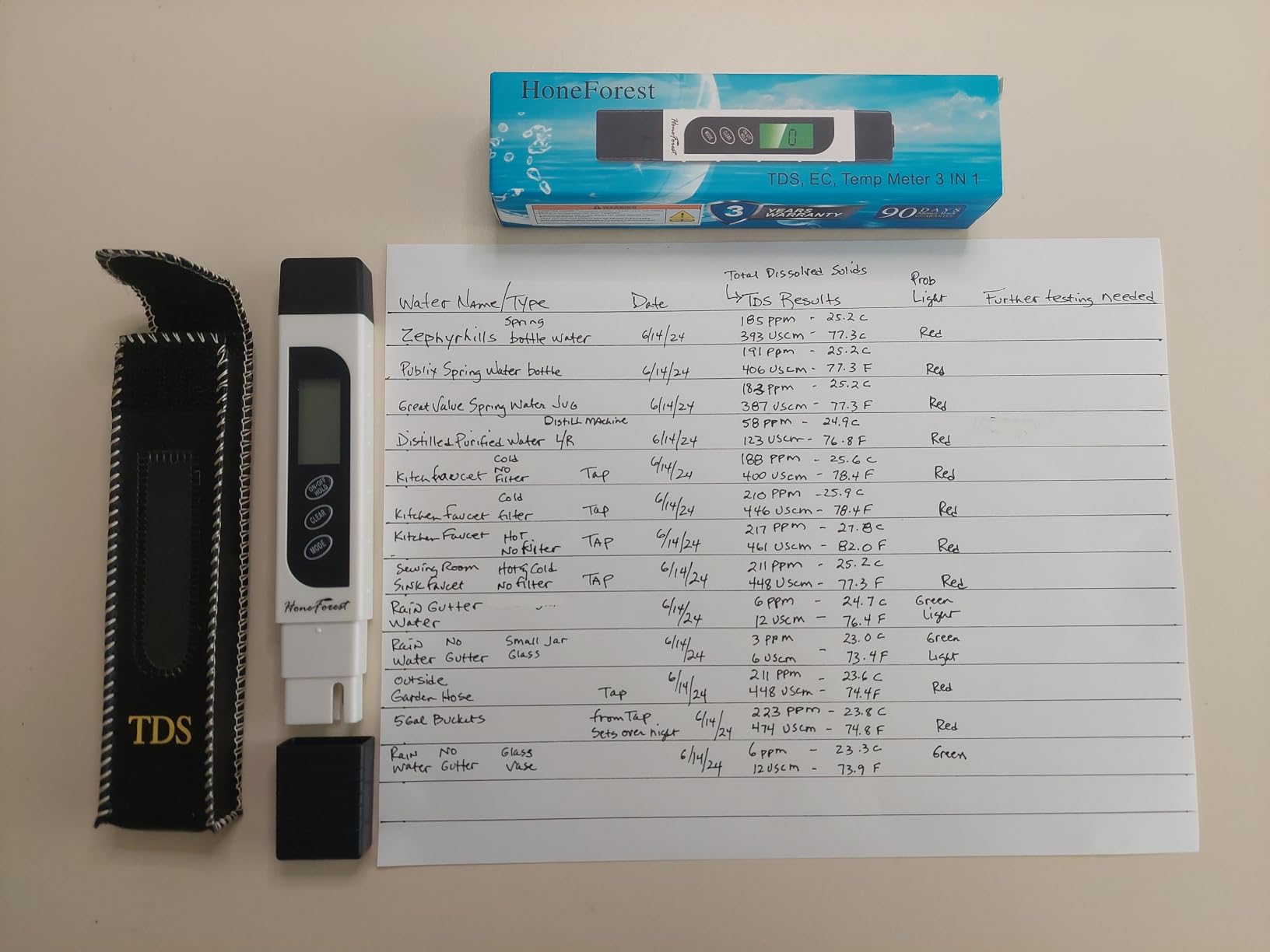 I used this to test all the water resources we use around our house. I brought this to test my rain water because I notice my vegetable garden grows 5x bigger after a good rain than from watering my garden from my outside garden hose. See the results for yourself. I will definitely be using rain water to water my garden from now on. We drink bottle spring water but it was nice to know that our county water was in the acceptable range with no concerns for addition testing needed at this time. This is a great handy device to keep in your preper kit.