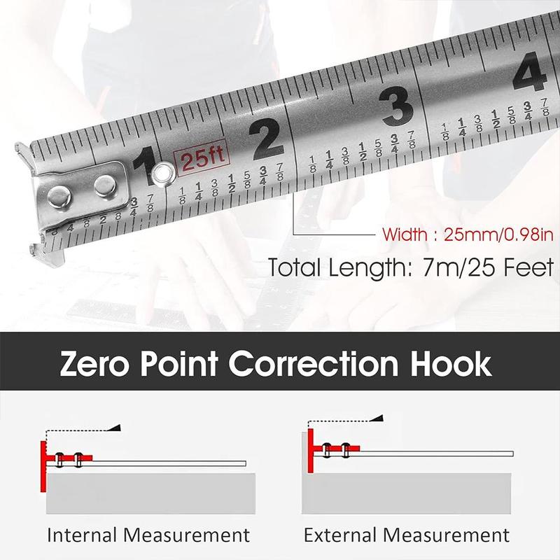 7.5m/25FT Retractable Tape: The length of the retractable tape is 7.5m/25ft, with a tape width of 2.5cm/0.98inch. The tape has clear markings on both sides, with imperial measurements (FT) on the front and metric measurements (cm) on the back, meeting almost all measurement needs.