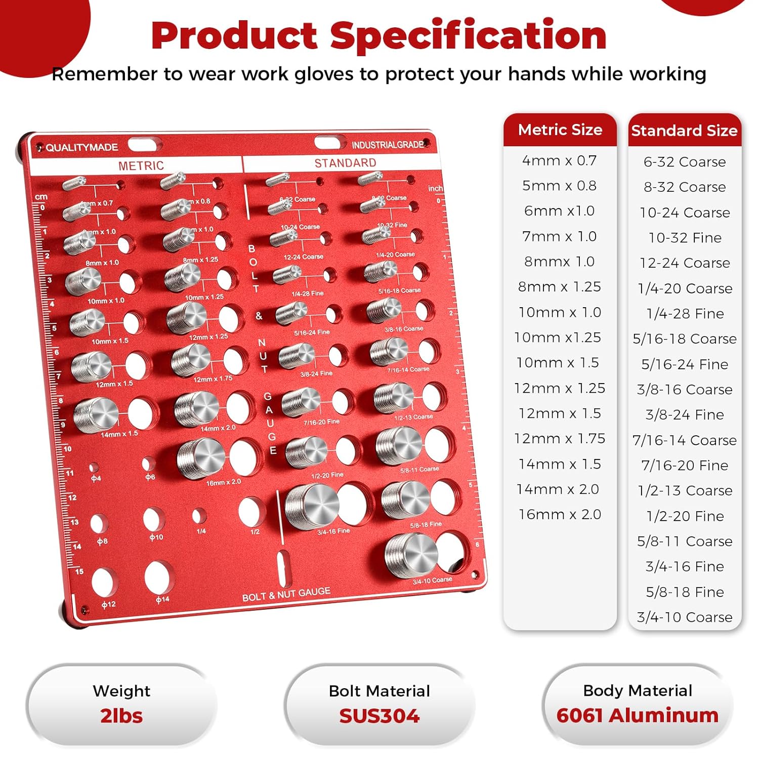 - 【WIDE RANGE OF SIZES】The nut and bolt thread checker not only quickly identifies 34 different nut and bolt sizes, including 15 metric sizes (m4 x 0.7 to m16 x 2.0) and 19 standard sizes (6 -32 coarse to 3/4-16 fine), but also comes with 8 imperial drill gauges to meet your needs for fast and accurate identification of a wide range of thread sizes and types.