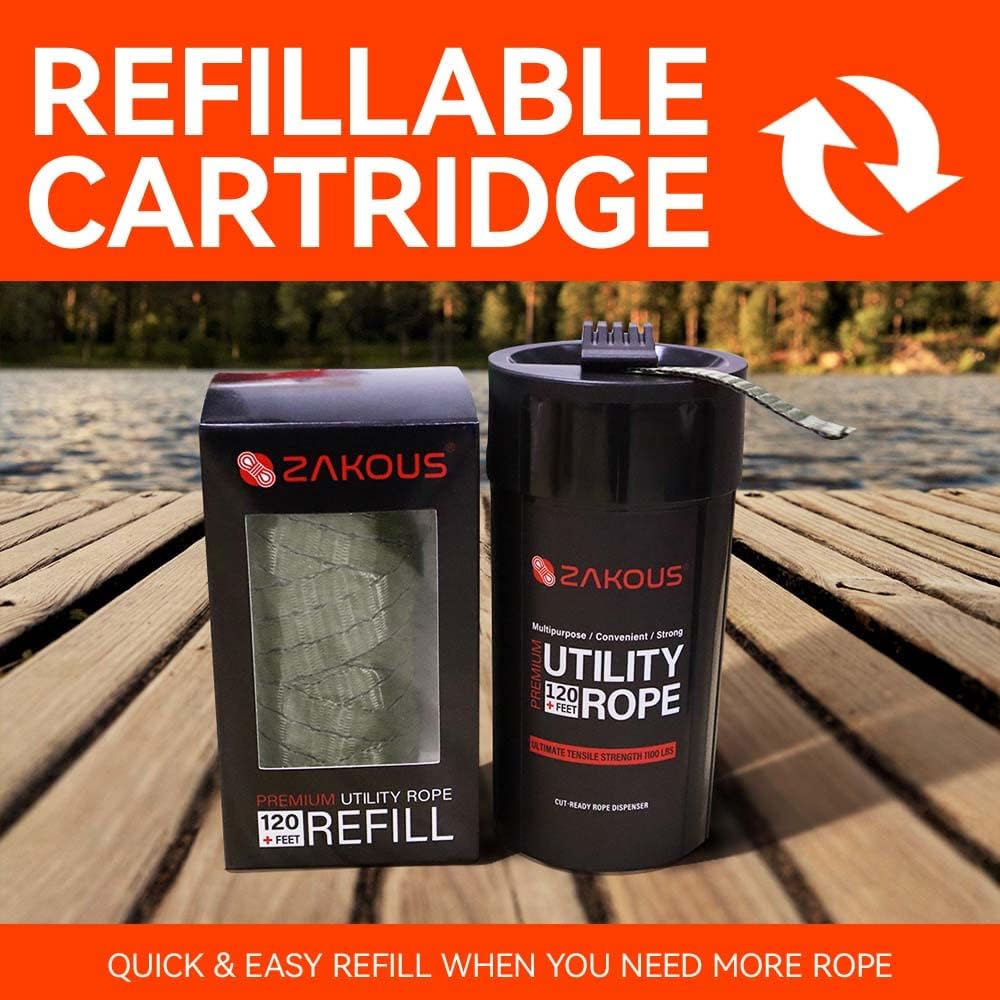 MULTI-USE UTILITY ROPE : Zakous Utility Rope will fit anywhere! Truck, RV, ATV, UTV, Boat, Backpack, House, Garage, Cabin. Use it for Camping, Hiking, Fishing, Hunting, Ranching and gardeningREFILLABLE : Save the canister because we have refills. Quickly & Easily refill when you need more rope. Please take look into our zakous store for more details in rope refills