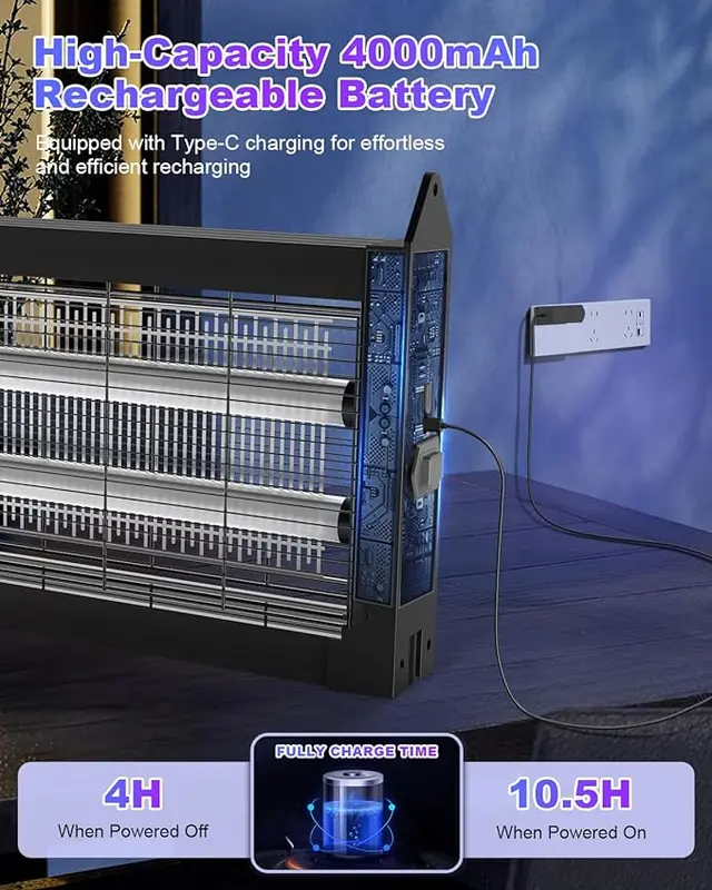 • 【4500V High-Effective Electric Bug Zapper Solar Powered】 Utilizes a high-intensity light bulb with a wavelength of 365-395nm, drawing insects within a coverage area of 1/2 Acre.Once mosquitoes, moths are lured in by the bug light, they are promptly eliminated by the 4500V high-voltage electrified grid. Say goodbye to pesky bloodsuckers without needing to resort to chemicals, baits, or raiation.