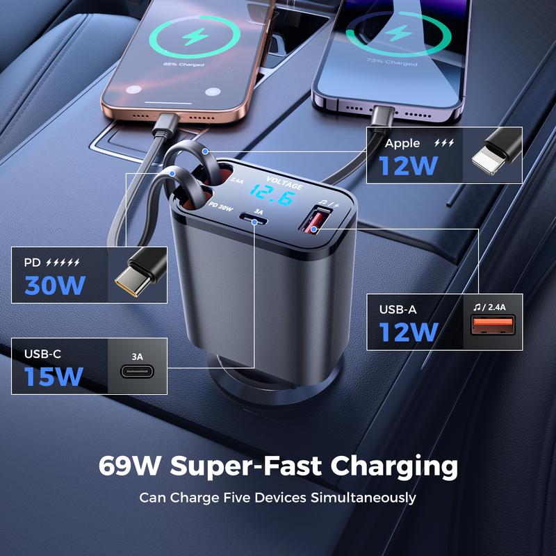 • 69W 4-Port Charging Powerhouse: The SUPERONE 69W Bluetooth Transmitter with multi port, with its PD 30W USB C and 12W Apple retractable cables, alongside a 15W USB C and 12W USB A port, delivers high-efficiency charging for five devices simultaneously.