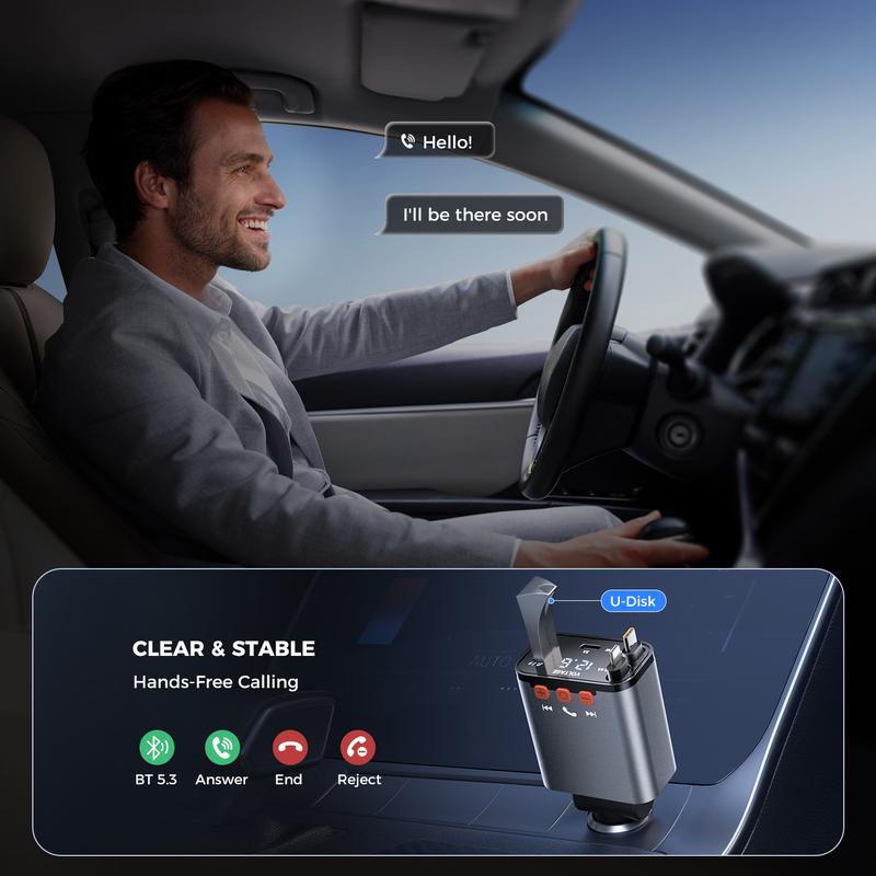 • ⚡ PD USB C & Apple Retractable Cables: To enhance your driving experience, our fm transmitter includes a 30W USB C and a 12W USB Apple retractable cable, eliminating the need for extra cords and effortlessly charging both Apple and Android devices. The retractable cables of car charger extend up to 80cm and retract smoothly for a tidy car interior.