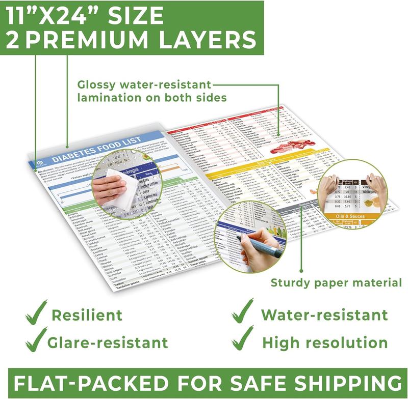 • DURABLE AND EASY-TO-USE DESIGN: Printed on high-quality material for durability, these charts are perfect for everyday use in kitchens, schools, and clinics with  a user-friendly layout that makes finding information quick and easy,includes diabetic food journal and printable diabetic meal plan to facilitate daily diabetic management.