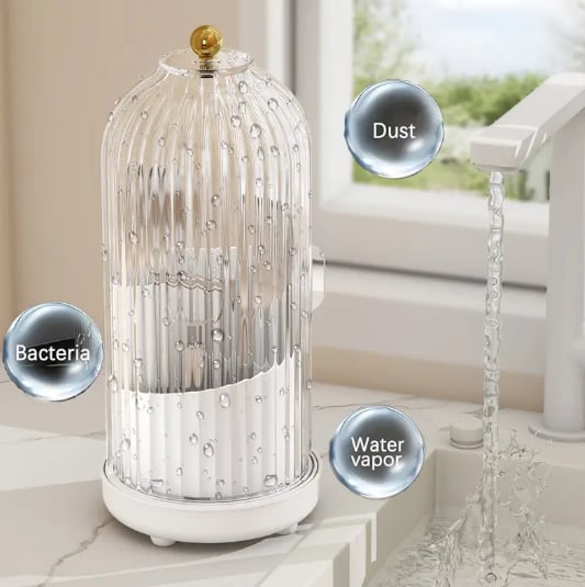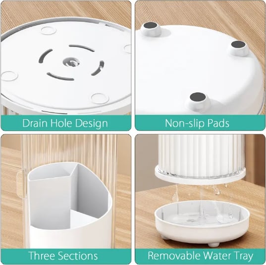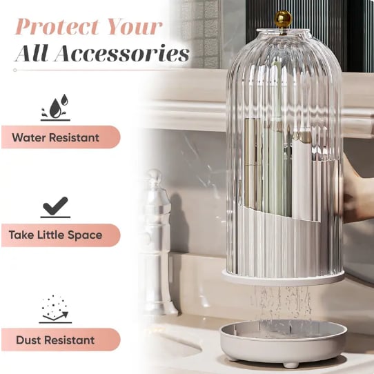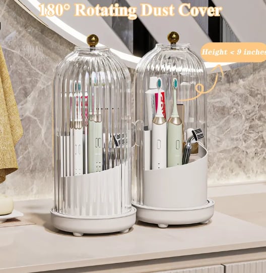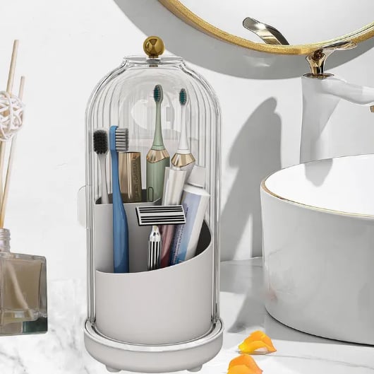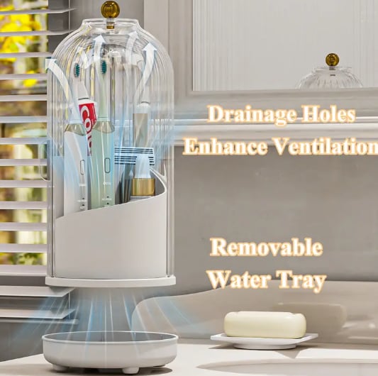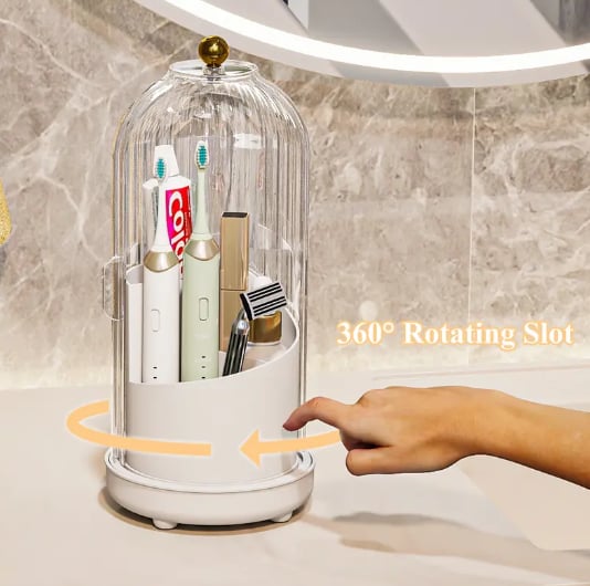 The inside of the toothbrush holder can be rotated 360° for easy access to your toothbrush, toothpaste and other items from any angle.
