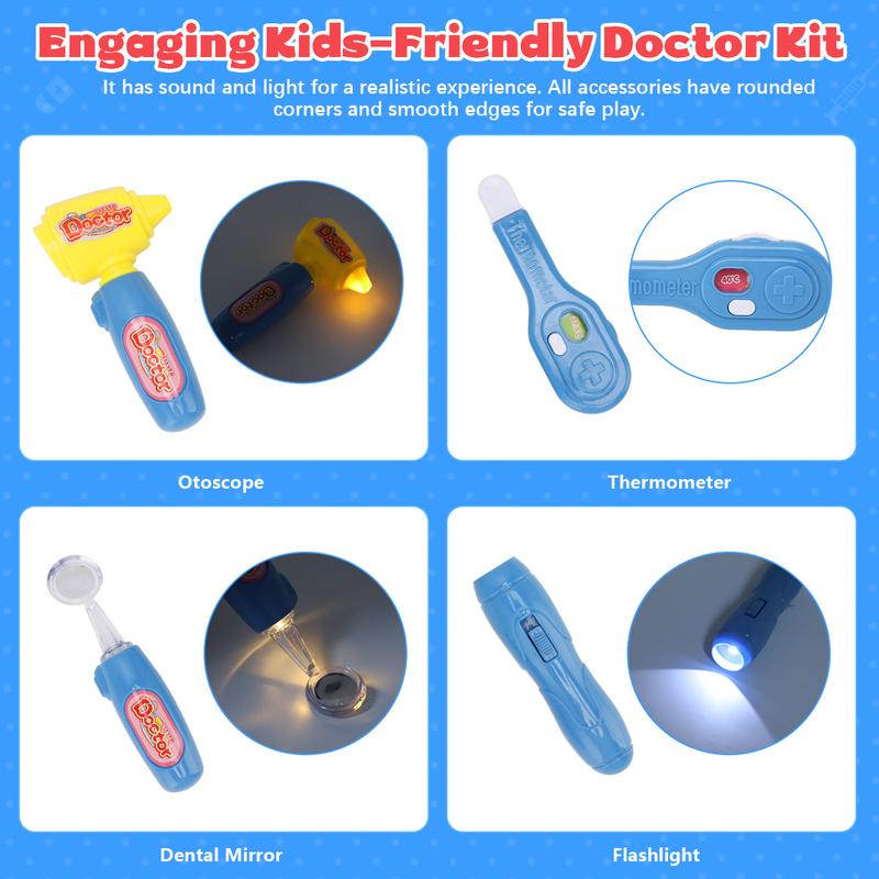 - 【SAFE AND DURABLE KIDS DOCTOR KIT】These tools are designed for little hands and easy to grasp. They are all made of durable ABS plastic materials, which are non-toxic, BPA-free and odor-free. There are no sharp objects or edges of these tools, so you don’t have to worry about kids hurting themselves while they play