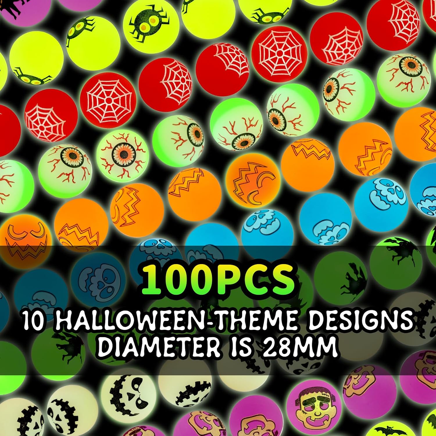 Super Value Halloween Party Favors - Package contains 100 piece of glow-in-the-dark bounce balls (1.1 inches) with 10 style designs. Pumpkin, spider, ghost, bat, castle, skull, cats...providing a plentiful supply for Halloween party favors and activities.