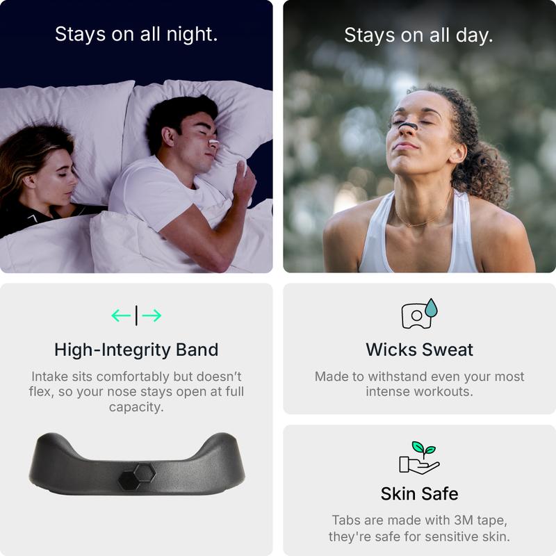 PATENTED TECHNOLOGY - Intake is a patented two-part nasal dilator system that features two independent nasal strips (Tabs) and a sturdy, magnetic relief band that work together to open your nasal passages to their widest capacity. Our innovative design provides optimal nasal airflow and a personalized, comfortable fit for each user.