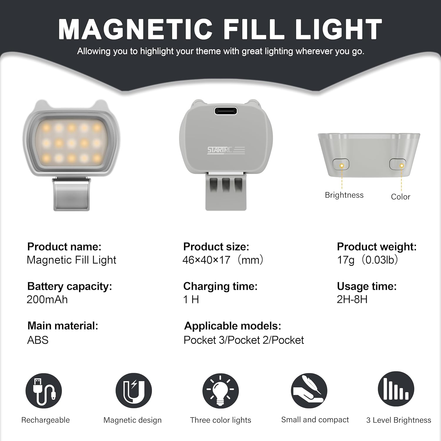 • 【Strong Magnetic】Special magnetic circuit closed design,Pocket 2 fill light attach to the handle with magnets, easy and fast installation, can be removed at any time to adjust the light mode.only 17g,it is super mini and lightweigh,easy to carry.