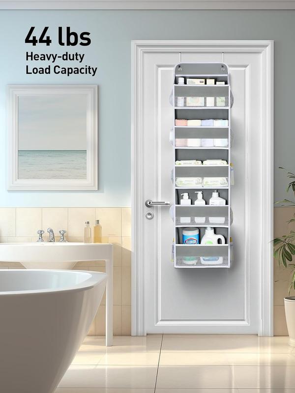 Sag-proof & 44lbs Load Capacity: Unlike the overdoor organizer hanging from other brands, our doorhanging organizer for bedroom has thickened cardboardand fiberglass to hold it flat and resist warp. So this dormroom essentials can stay put without deforming evenwhen you load heavier things up to 44 lbs and does notmove/sway when you open or close the door