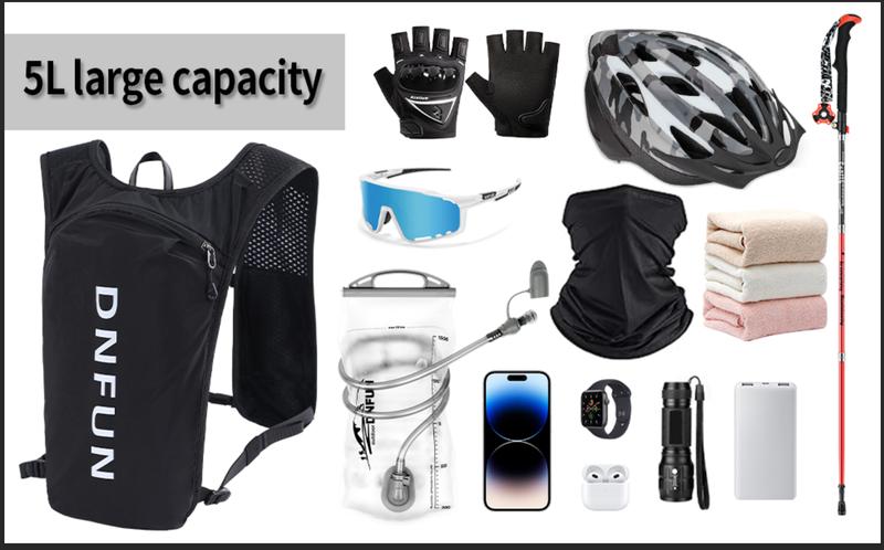 2.【Ultra-Lightweight Design】 High-quality nylon material and ultra-lightweight design make running hydration vest more comfortable to drive. The DNFUN running water vest weighs only 140 grams and can hold 1.5L water bladder in the main compartment. In addition, the left and right belts have pockets for storing 500 ml PET water bottles. Next to the main pocket, there is a pocket for storing mobile phones and items, so you can jog, run while listening to music!
