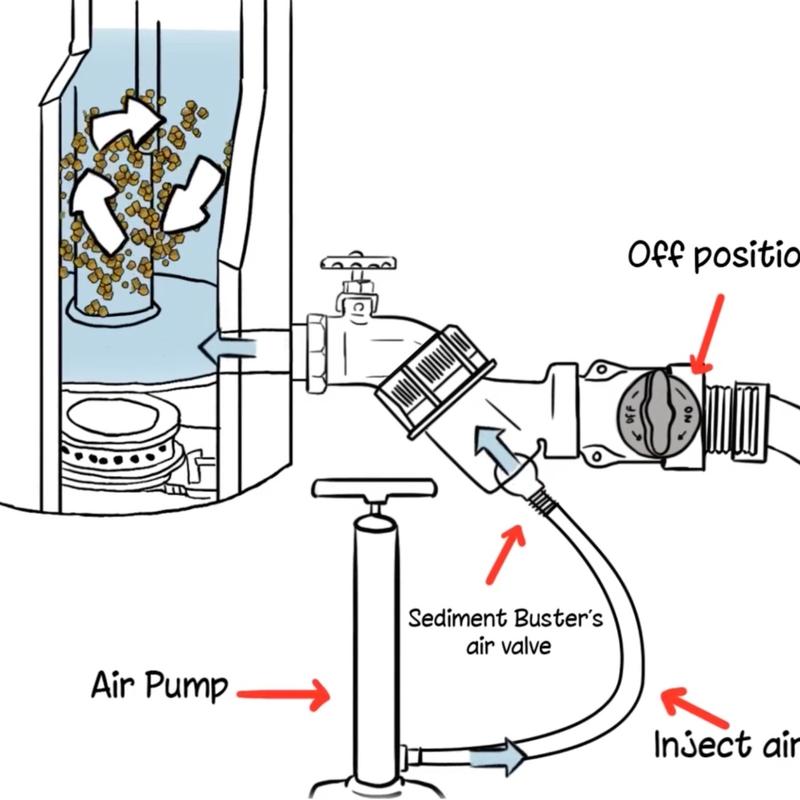 • Sediment Buster is a water heater cleaning tool that cleans and drains empty water heater tanks. Sediment Buster is a multi-functional tool that breaks up sediment clogs, empties tanks with just air pressure, and stirs, lifts, and removes unwanted dirt, sediment, and minerals from the tank.