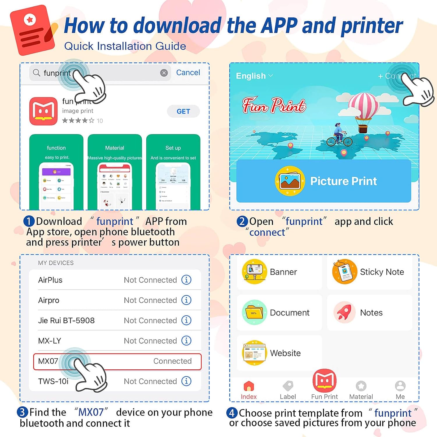 Large Quantities --- This package comes with 1 portable mini printer, 10 rolls of ordinary thermal paper and sticker paper with 2.2" wide, 1 USB cable and 1 user guide, which is a great set to meet your diverse needs and they are enough for family use. Any questions about the printer, please contact us for helpEasy to Use and Set Up to the APP --- When you use the mini pocket printer for iphone, you can basically download the app "funprint", charge up the printer, open the app and start printing. It's easy to operate, please check the instructions and follow. This mini impresora portatil support wireless BT 4.0 with phone to connect with iPhone/smartphone printer easily and quickly within seconds