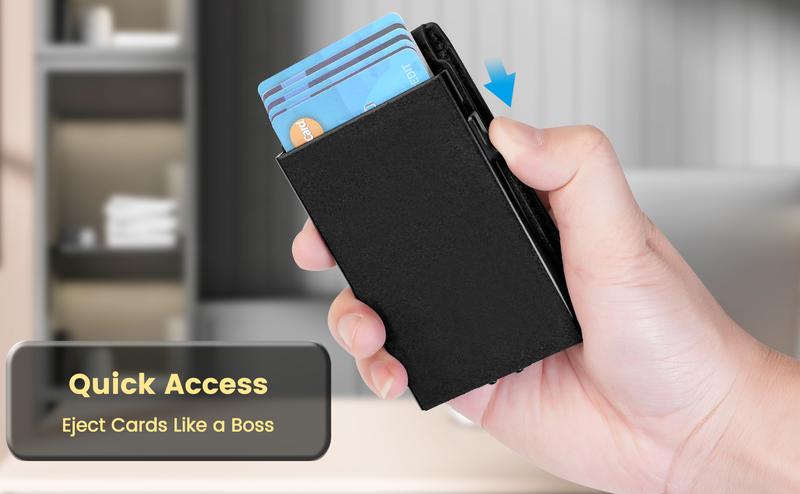 ·[Sleek and Innovative Design] Crafted with high-quality water-resistant microfiber leather for the cover, our wallet combines style with functionality. The premium metal chamber of the aluminum wallet features a smooth eject pop-up function, easily activated by the ergonomic side button. Plus, the inner magnet in the cover allows for seamless attachment to the chamber, ensuring both security and convenience.